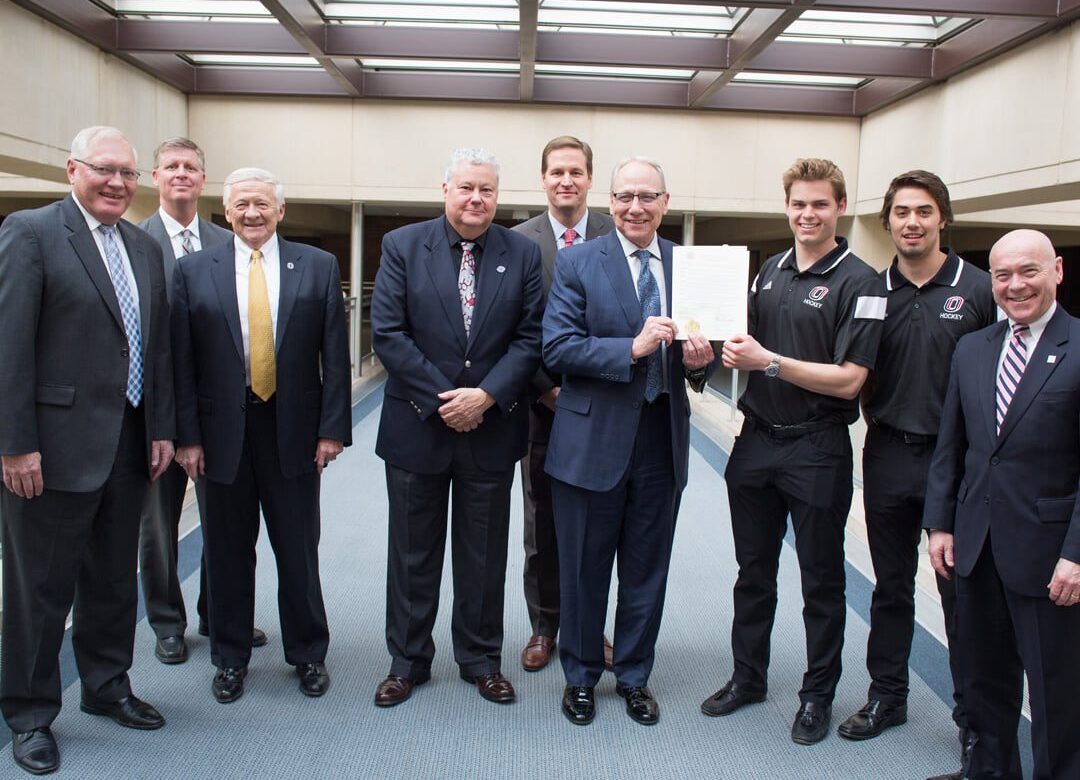 Omaha City Council declares April 21 UNO Maverick Hockey Day in Omaha, commemorating the team’s appearance in the Frozen Four. Players, coaches, UNO Chancellor John Christensen and Athletic Director Trev Alberts are on hand to accept the honor.