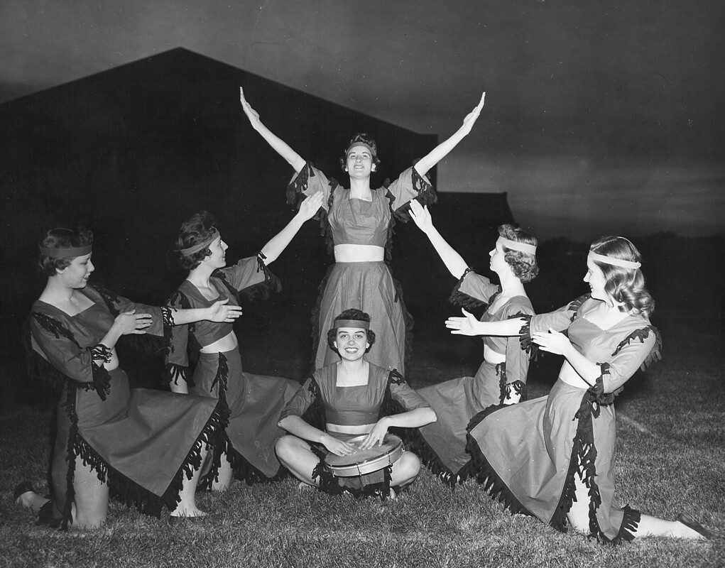 Omaha University band and Indiannes cheerleaders perform at Omaha Municipal Airport, greeting three planes of VIPs making their way from the East Coast to California as part of Mutual of Omaha’s 50th anniversary celebration