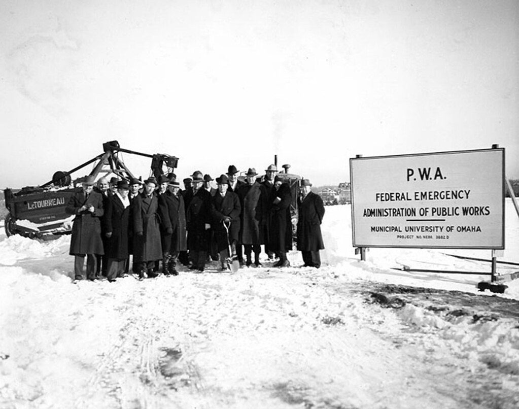 Ground broke for construction of the first building on the Dodge Steet campus; completed in 1938, the Administration Building (now Arts and Sciences Hall) served as the central hub for the university, including the library and cafeteria