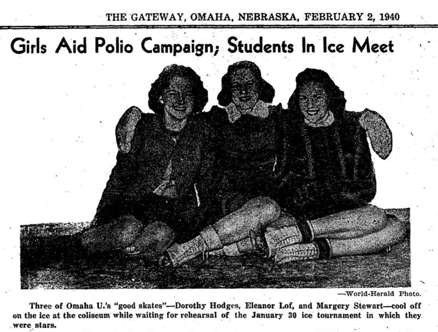OU student Dorothy Hodges wins the 220 ice skating race at Ak-Sar-Ben Coliseum in the Birthday Ball fundraiser for the infantile paralysis (polio) relief drive; fellow OU students Alice Egner and Margery Stewart finished second and third, respectively