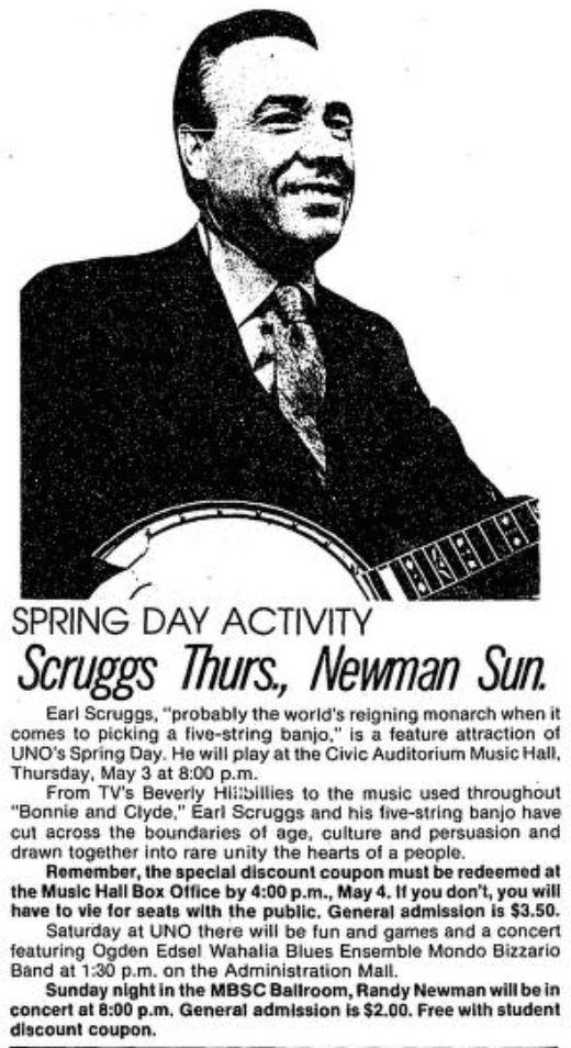 Earl Scruggs, "probably the world's reigning monarch when it comes to picking a five-string banjo," noted The Gateway, performs at Civic Auditorium Music Hall for UNO's Spring Day