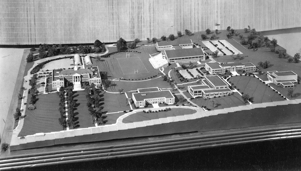 University Board of Regents present a model of the campus "as it will look when all buildings are completed." The model was produced by architects John Latenser and Sons.