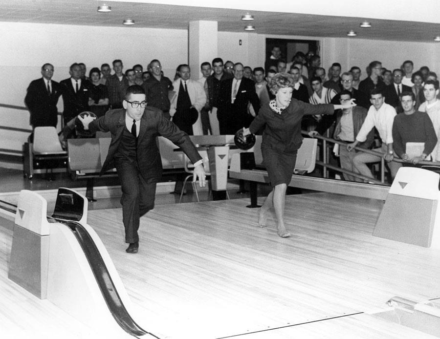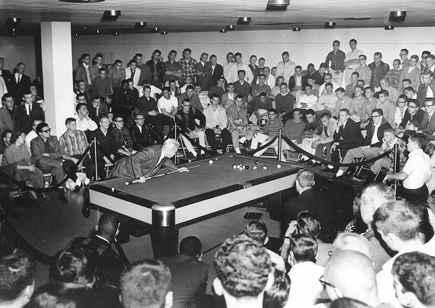 World Champion billiards player Willie Mosconi holds an exhibition in the student center.