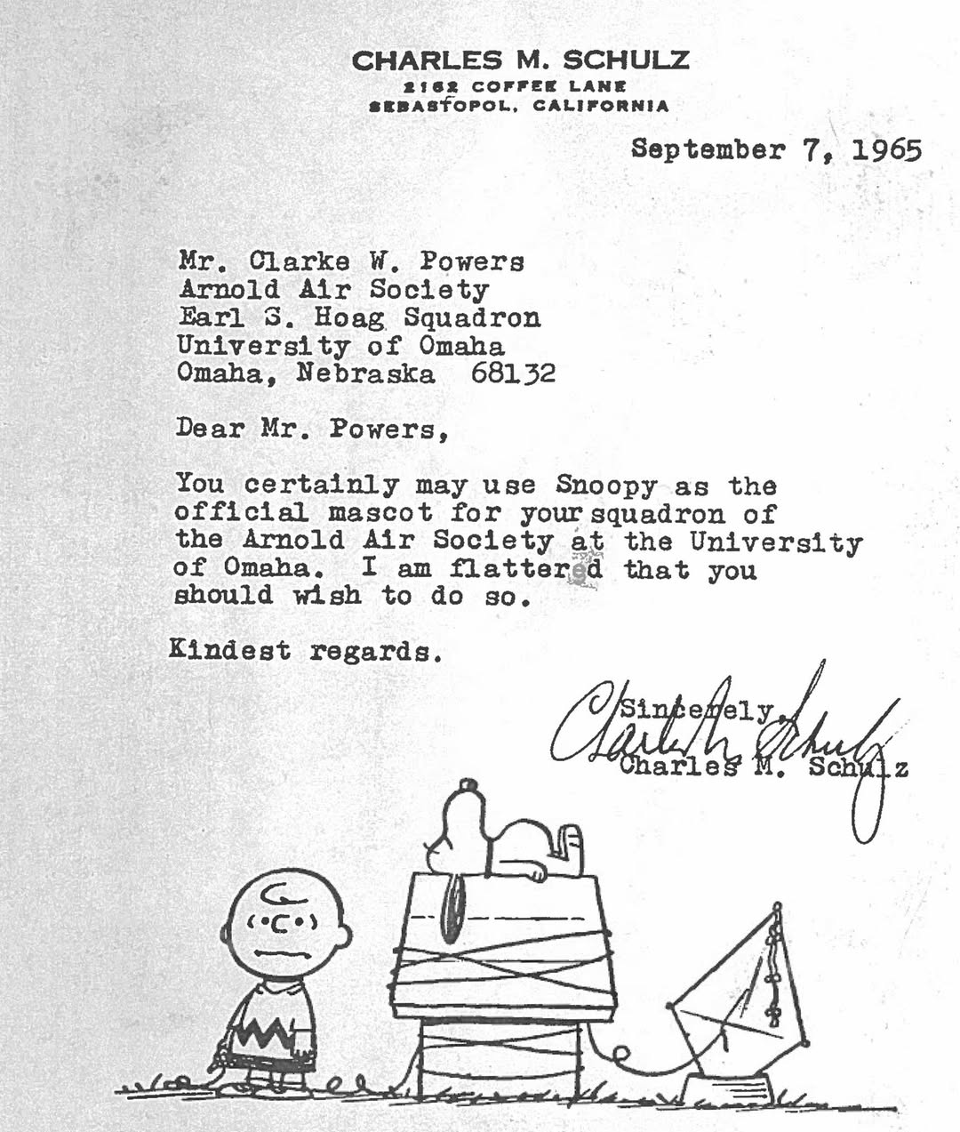 “Peanuts” illustrator Charles Schulz approves ROTC’s use of Snoopy as the official mascot of the Earl S. Hoag Squadron, Arnold Air Society, Detachment 470. A letter from Schulz and two Gateway articles document the approval.