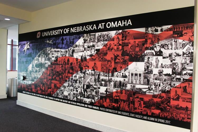 The University of Nebraska at Omaha’s Office of Student Affairs celebrated its military, veterans and their families with a new mural in the Milo Bail Student Center! Inspired by the value of building community, the red, white and blue mural is composed of personal snapshots of current students, alumni and community members.